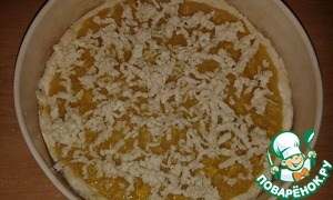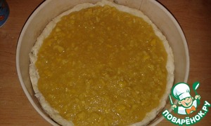 Большую часть теста распределить по форме, сделав небольшие бортики. Выложить начинку