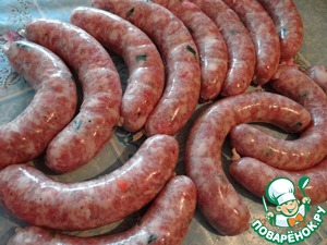 Набить подготовленные кишки, не допуская попадания воздуха (с помощью мясорубки или колбасного шприца) не очень плотно, чтобы иметь возможность потом сформировать колбаски, нужной вам длинны;