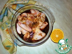Приготовим маринад: выдавим сок половины апельсина, добавим тертый на мелкой терке корень имбиря, чеснок и измельченный перец чили (по желанию).