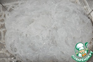 Пока курица и овощи маринуются, варим фунчозу, согласно инструкции на упаковке. Я кладу в кипяток на 3 минуты.