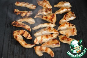 Маринованное куриное филе обжариваем на сковороде-гриль, приблизительно по 2 минуты с каждой стороны.