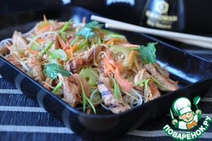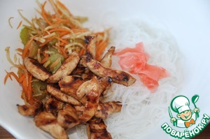 В фунчозу кладём филе курицы-гриль, маринованные овощи вместе с маринадом.