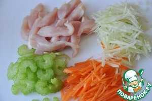 Редьку, сельдерей и морковь также нарезаем (натираем) тонкими полосками.