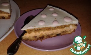 После застывания положить сверху вторую часть коржа и залить вторым кремом, приготовив его аналогично, кроме добавления пюре. Для "горошка" из второго крема взять пару столовых ложек, подкрасить вишневым соком и сделать рисунок