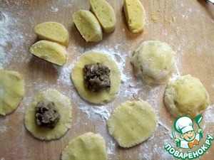 Из картофельного теста сделать лепешечки. На одну поместить начинку, другой накрыть и залепить края.