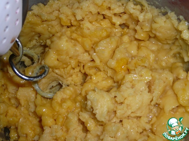 В чуть остывшую смесь (когда не обжигает пальцы) начинаю вводить по одному яйцу. Яйца сначала вбиваю в стакан и потом по одному вливаю в тесто, удобно. Размешиваю теми же венчиками-спиральками.