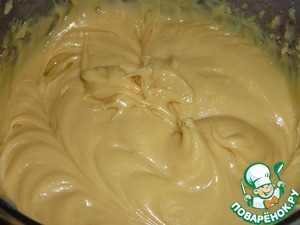 Пока работала духовка я залила желатин парой ложек молока и оставила набухать. И приготовила заварной крем. Сахар растерла с желтком. Влила молоко, все хорошо размешала и уварила на малом огне до загустения. Сняла с огня. Размоченный желатин ввела в еще горячий крем. Размешала до растворения желатина.