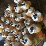 Из этой порции теста у меня получилось 28-ть профитролей. (общий вес 250 г). Как известно, разница между профитролями и эклерами -- в размере. Профитроли мелкие, округлые, не более 4 см в диаметре, эклеры же продолговатые.