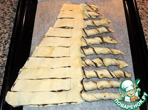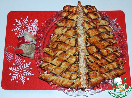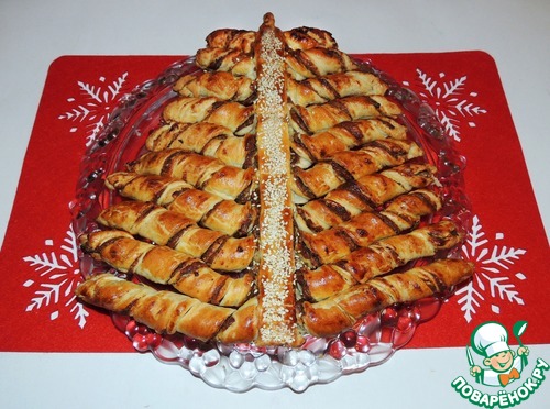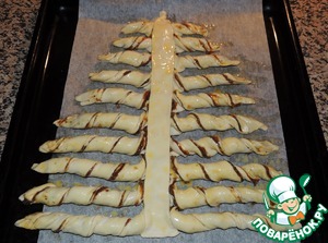 Наложить сверху вторую заготовку и скрутить жгутами "ветки" будущей елочки. У меня осталось немного начинки - я распределила ее по "стволу" и накрыла полоской из остатков теста.