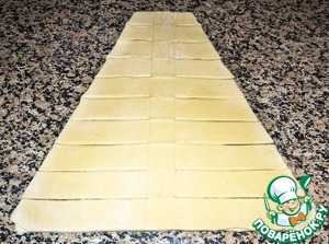 Слоеное тесто разморозить и раскатать, присыпая мукой, до увеличения площади листа в 2-2,5 раза. Сложить оба листа и острым ножом вырезать заготовку.