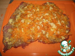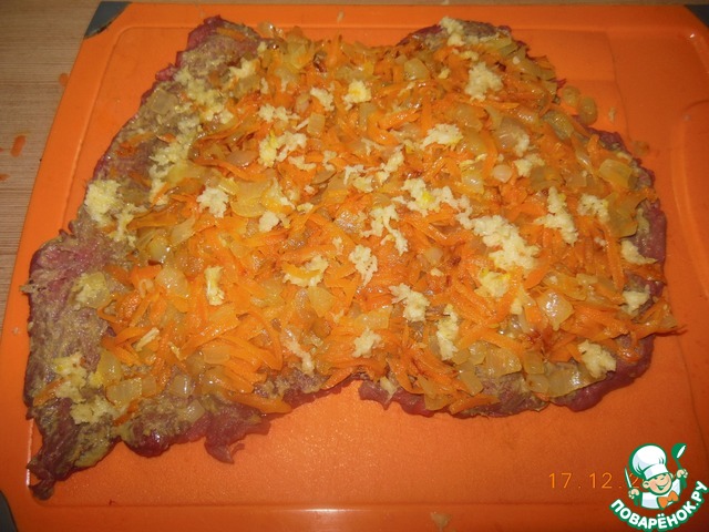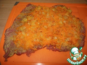 Приступим. На наше мясо выкладываем жареный лук и морковь. С одной стороны оставить сантиметра 3-4 пустым (дальний от себя край).
