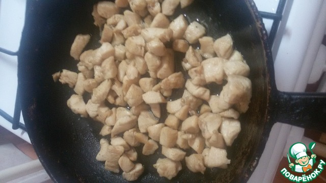Куриное филе нарезать мелкими кусочками, обжарить на масле до готовности, посолить, поперчить по вкусу.