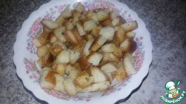 Готовим крутоны. Батон нарезать кубиками, обжарить до золотистой корочки на заранее подготовленном масле. 5 ст. л масла смешать с зубчиком чеснока пропущенным через пресс.