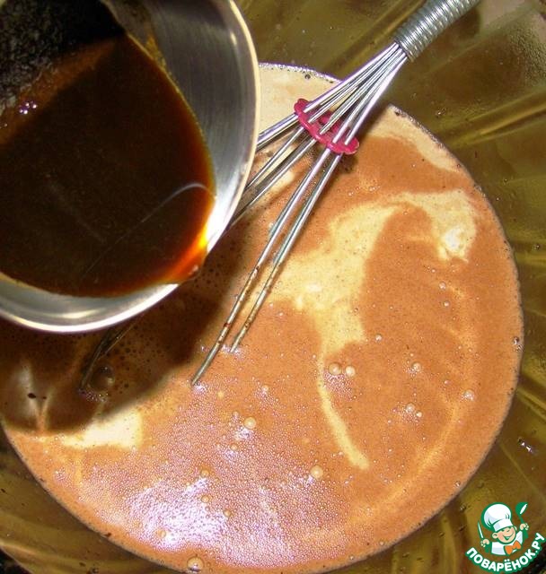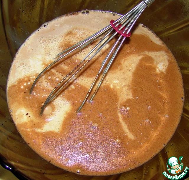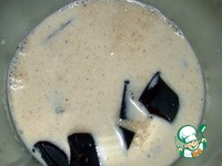 Добавляем шоколадную смесь в яичную, доливаем оставшееся молоко со сливками, хорошо все перемешиваем. |