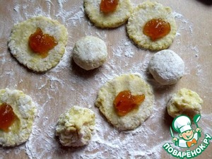 Размешать и из полученного теста оформить небольшие лепешки, в середину каждой из них положить по ложечке повидла.