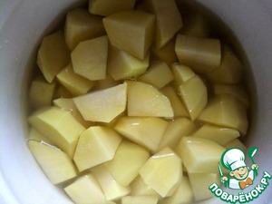 Приготовить картофельное пюре: слить воду, измельчить картофель, добавить яйцо и сливочное масло. Затем натереть на терке сыр и вмешать в пюре половину тертого сыра.