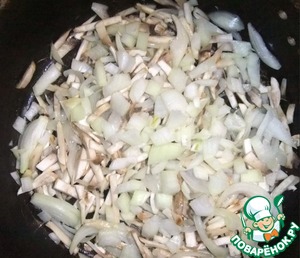 На растительном масле обжарить лук. Добавить грибы, тушить 5 минут.