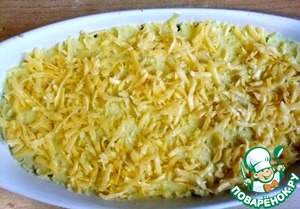 Сверху уложить оставшийся картофель. Посыпать все тертым сыром.