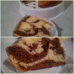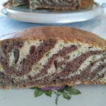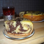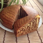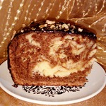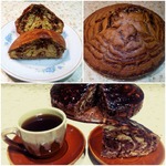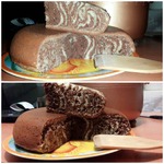 Тесто разделить на 2 части. В одну добавить какао и взбить. Чашу МВ смазать маслом и поочередно в центр чаши выкладывать по 1 ст л темное и светлое тесто, пока тесто не закончится.