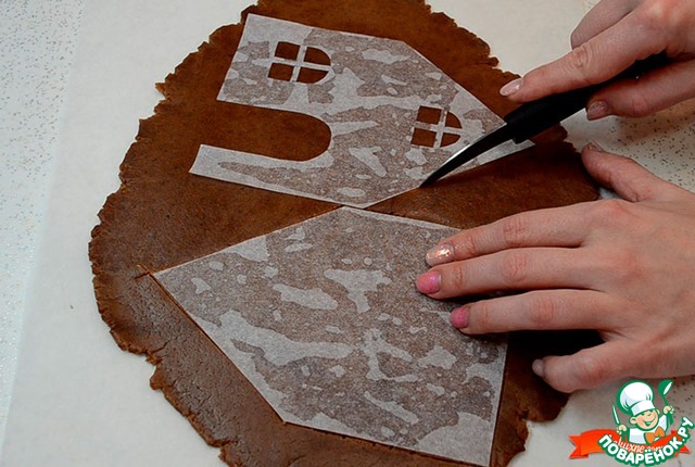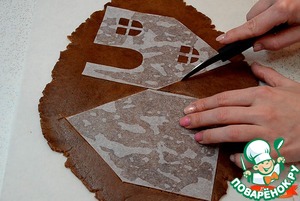 На лист пергамента положить тесто, накрыть вторым листом, раскатать тесто толщиной в 0,4 см. Положить трафарет, вырезать ножом детали домика. Дверь вынуть и положить рядом с деталями. Трафарет нужно нарисовать на бумаге и вырезать.