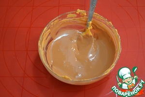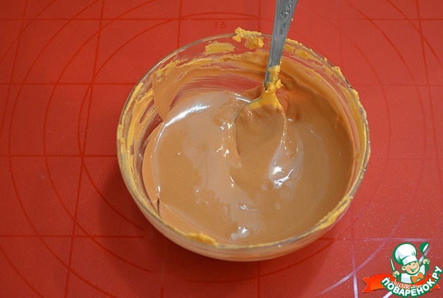 Красим глазурь в кирпичный цвет, для начала добавляем оранжевый краситель, затем коричневый, если у вас есть изначально такой цвет, то используйте его.