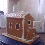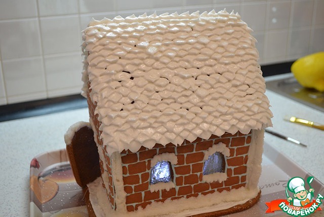 Готовим глазурь, наполняем кондитерский мешок с насадкой для листиков. Наносим снег на крышу, присыпаем слегка сахаром, даем домику высохнуть.