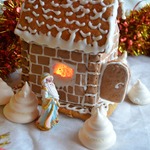 [+4]Прежде всего, сам процесс мне понравился. Откровенно говоря, предполагала, что вырезание деталей отнимет много времени, как например, формовка печенья, но дело пошло быстро. Бумажные трафареты вполне удобны в работе, зря я в них сомневалась. Важный момент, который стал очевиден только на этапе сборки: детали крыши лучше раскатать потоньше, тогда домик можно сразу собирать целиком. На фото плохо видно, но я сделала узоры на стенах формочками из набора для украшения тортов, получилось вполне симпатично. Во многих источниках встречается рекомендация засыпать карамель в окошки, когда деталь уже почти готова, чтобы карамель не сгорела. Это неправда, карамель растапливается долго, и засыпать ее в окошки надо сразу, как и советует автор рецепта. В окошки 4*5 см пошло по пол-карамельки. "Дюшес" мне понравился больше "барбариса", расплавившись, он становится полупрозрачным.