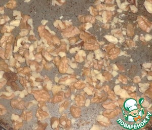 Грецкие орехи поджариваем на сухой сковороде около 2 минут на медленном огне. Выключаем огонь и оставляем орехи на сковороде.