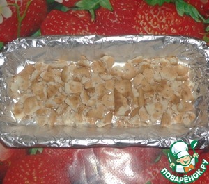 Форму для застывания конфет застилаем фольгой и смазываем растопленным сливочным маслом. На дно формы выкладываем кусочки сладкого крекера.