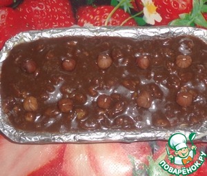 Выливаем основную массу в форму. Сверху раскладываем цельный фундук так, чтобы при делении на отдельные конфеты в середине одной конфеты был фундук.