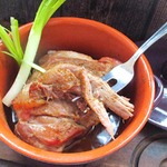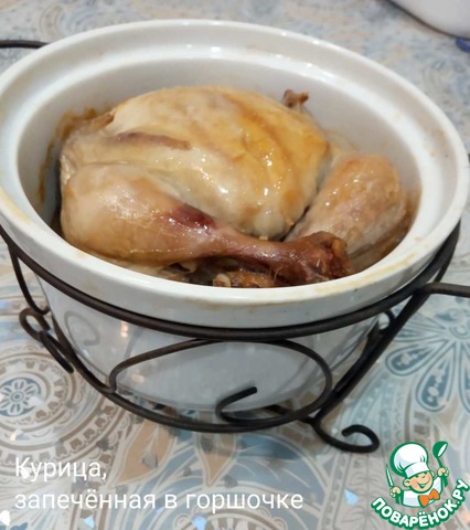 [+5]В последний (очередной!) раз вот запекла в горшочке курицу целиком, так же хороши получаются и окорочка, в мою 2-л фарфоровую посудинку очень хорошо укладываются три штуки среднего размера, не маленькие (шкуркой кверху). И, как видите, под крышкой курятина вполне прилично подрумянивается, можно и чуть сильнее запечь, на дне выделяется совсем немного сока, на небольшой соусничек, как раз полить гарнир.
