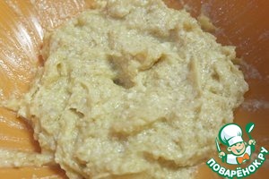 Всыпаем орехи, ванильный сахар, разрыхлитель, крахмал, муку. Все перемешиваем. Получается довольно густая масса.