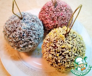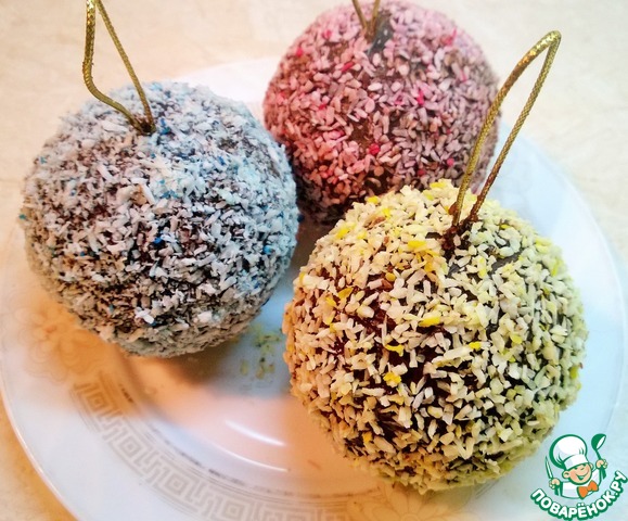 Обмазываем шар растопленным шоколадом и обваливаем в кокосовой стружке. У меня цветная кокосовая стружка. Готовые шары остудить.