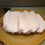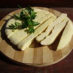 Сделала раствор из соли и воды. Творожный сыр нарезала пластинами толщиной 1,5 см., уложила в миску и залила раствором из соли. Оставила на 3-4 часа.