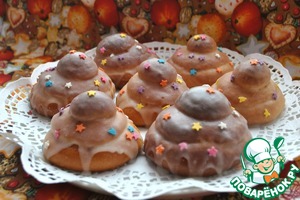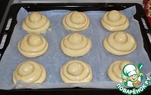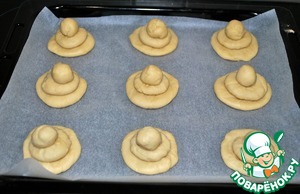7. Из большого и среднего шарика делаем лепешечки, накладываем один на другой и сверху этой башенки маленький шарик. Получилось 18 таких булочек.