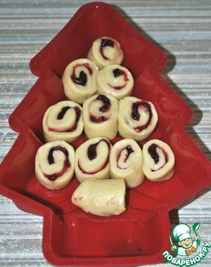 8. У меня 2 противня и по скольку они полностью были заняты булочками, а теста асталось на еще 1 -1,5 булочку, то я решила воспользоваться идеей Светика (avani) и соорудила такую елочку со смородиновым вареньем.