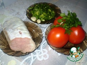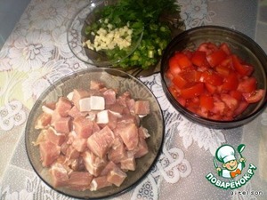Режем кубиками мясо и помидоры, лук и зелень измельчаем по желанию.