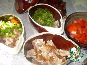 В горшочки выкладываем мясо, солим, добавляем специи по желанию и вкусу (у меня "Для жаркого").