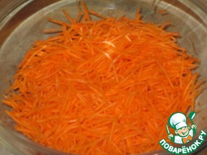 Пока жарится лук, собираем в миске морковь, болгарский перец и мясо