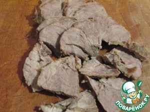 Отваренную и остуженную говядину нарезаем крупными ломтиками