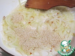 Когда лук слегка поджарится, добавляем кунжут и обжариваем еще немного