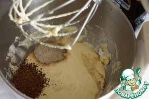 Добавить ванильный сахар, кофе и коньяк, слегка взбить, добавить просеянную мук и разрыхлитель. Замесить тесто (простите, но тут я забыла сфоткать)