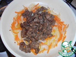 Теперь печень отправляем в сковородку с луком и морковью перемешиваем жарим 2 минуты, затем закрываем крышкой и тушим еще 5 минут.