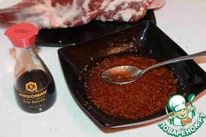 • Делаем маринад для баранины. Для этого смешиваем соевый соус Kikkoman, растительное масло, розмарин, перец, соль и сахар.