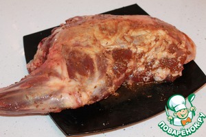 • Баранью ногу моем. Обтираем. Делаем надрезы и шпигуем нарезанным чесноком.