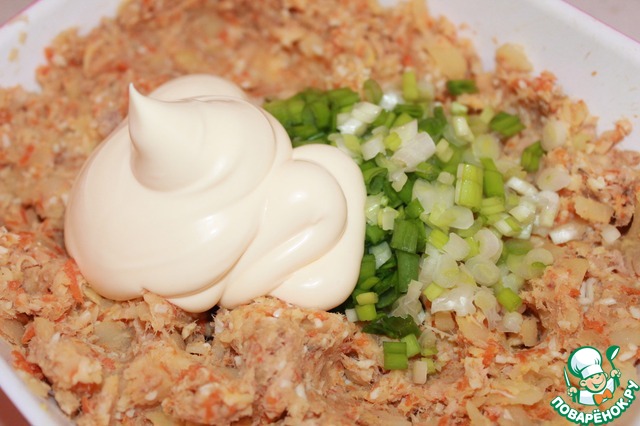 Добавляем майонез и мелко нарезанный зеленый лук. Все тщательно перемешиваем.
