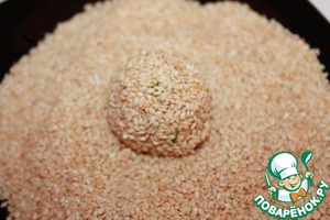Обваливаем каждый шарик в кунжуте. Подаем к столу. Если Вы не любитель кунжута, можете его заменить на мелко нарезанный укроп, и у вас получатся зеленые шарики. Но с кунжутом очень вкусно.