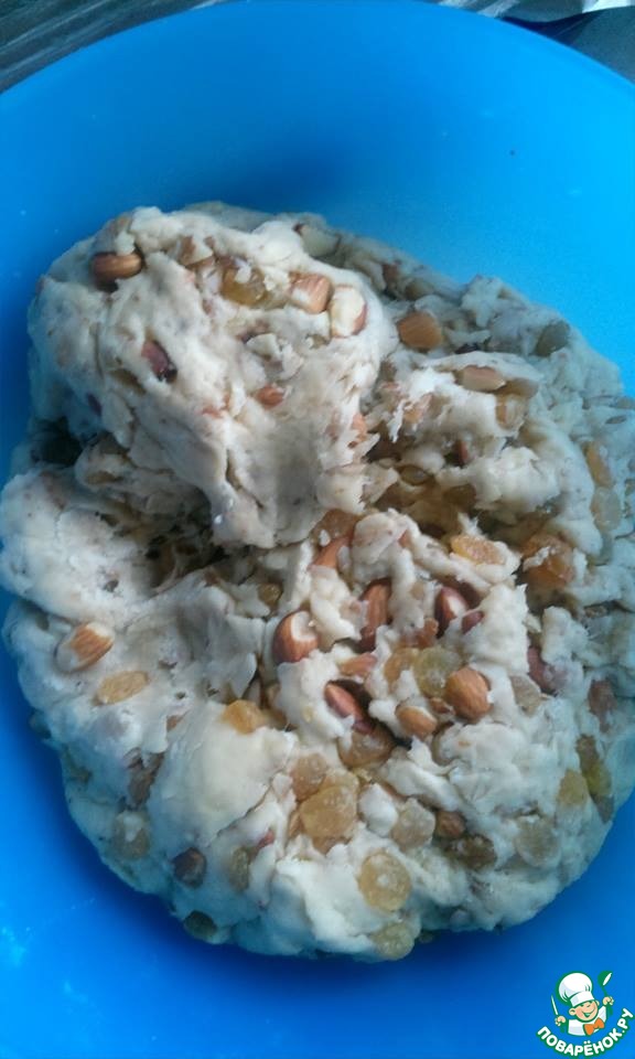 Когда опара подойдет (увеличитьтся раза в два), добавить муки, мягкого масла, корицы, соль, изюм, миндаль, сок лимона, другие специи. Вымешать. Тесто будет плотное и тяжелое. Месить сложновато. Сформировать комок и оставить в тепле на 2,5 ч. За это время два раза обминать.