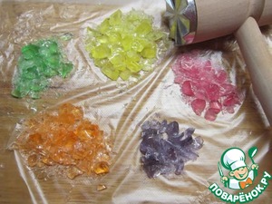 За это время нужно измельчить (на несколько кусочков) леденцы. Толочь леденцы лучше между двумя мешочками, так они не будут разлетаться.