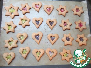 Противень с печеньем вынуть из духовки, в серединки печенья насыпаем леденцовые кусочки и опять поставим в духовку на 2 минуты, чтобы леденцы расплавились. Нужно следить, чтоб леденцы не превратились в жженый сахар. Если они начнут немного пузыриться, ничего страшного, при остывании все пузырьки разгладятся. Прежде чем снять печенье с противня, нужно чтоб оно остыло и леденец затвердел.